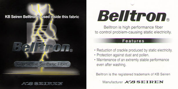 Belltron® คือนวัตกรรมใหม่ล่าสุดจากญี่ปุ่น ใช้ในการผลิตผ้า มีคุณสมบัติป้องกันไฟฟ้าสถิต แบบถาวร สามารถนำไปใช้ในอุตสาหกรรม อิเล็กโทรนิค คอมพิวเตอร์ เลนส์ และเหมาะสำหรับผู้ที่เป็นโรค ภูมิแพ้ โดย Belltron® สามารถป้องกันฝุ่น ละอองเกสรดอกไม้ติดตามเสื้อผ้า คุณภาพในการป้องกันไฟฟ้าสถิตไม่เสื่อมสภาพไปหลังการซักล้าง เพราะเป็นการผสม CONDUCTIVE FIBER ในเส้นใย ไม่เหมือนผ้าอื่น ที่ทำแค่เคลือบน้ำยาป้องกันไฟฟ้าสถิต และจางหายหลังจากการซักล้าง